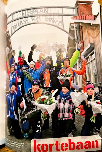 En allemachtech wat ride de Nederlanders op dit moment fantastys! Ik zag dat je gisteren in jouw dagboek een mij bekende foto plaatste. Die is gemaakt op 20 januari 2013 toen op de ijsbaan in Sneek het Fries kampioenschap kortebaan voor de oudste pupillen werd geplaatst. Die foto stond indertijd in het schaatsjaarboek Schaatsseizoen 2012-2013, waarvan ik de eindredacteur was. De door mij gemaakte foto stond op pagina 243 op een titelpagina in dat boek. De rode letters kortebaan (rechtsonder op jouw dagboekfoto) maken onmiddellijk duidelijk welke bron is gebruikt. Tussen haakjes: dat boek verschijnt nog steeds. In november 2025 verscheen de 53ste jaargang. Deze ‘krasse knar’ nam in 1973 het initiatief en is betrokken geweest bij alle 53 edities. Na afloop van dat kampioenschap in 2013 werd zowel bij de jongens als de meisjes de top-4 gehuldigd op een podium op het ijs. Maar ik herinner me nog als de dag van gisteren dat de (in maart 2023 overleden) voorzitter Jacob Akkerman na afloop van dit huldiging vroeg of de jongens en meisjes mee wilden komen om ook nog een foto te maken voor de poort van de ijsbaan. Hij kreeg dat zowaar voor elkaar. Hij staat op de foto in het midden achter met links naast hem Johannes de Vries (Grou), de vertegenwoordiger van de ‘Bond van IJsclubs’(Gewest Friesland KNSB).
