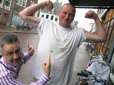 Paul ' Hufter ' & ik tegare tidens de overhandeging fan ut SNEEKWEEK '09 HUFTER polo ' Wat bin' we moai fut nyt?! ' ( foto: Fred de Groot )