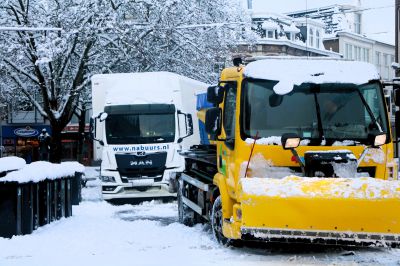 De besneeuwde straten rondom het plein zorgen ervoor dat vrachtwagens maar met moeite kunnen draaien en achteruit kunnen steken. Op meerdere plekken ligt aangestampte sneeuw en ijs, wat het risico op slippen vergroot. Chauffeurs moeten uiterst voorzichtig te werk gaan om schade en gevaarlijke situaties te voorkomen.