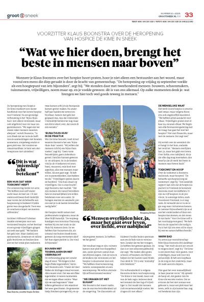 Fandaach was un interviewdach. Fanmòrren om 09.00 bij Klaus Boonstra, bestuursfoarsitter fan De Kime, Hospice in Sneek/SWF. ‘k Was echt onder de indruk fan wat al dy frijwillegers tegare met de proffesionals doën.