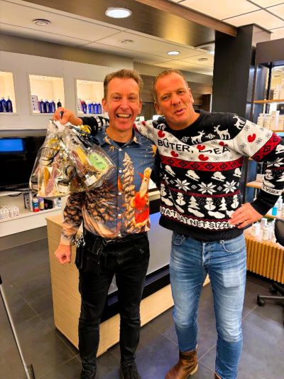 Wat ik wel even deel is un foto fan myn faste kapper Henk út Heerenveen en fan Remko, dy’t ik altyd pindaboer noem. Beide mannen waren in kleed in bysòndere kerst-outfit. Had bij Henk nyt helemaal ut gefoël dat hij um der senang in foëlde. Un foto was nyt ferboaden. Hierbij dus.