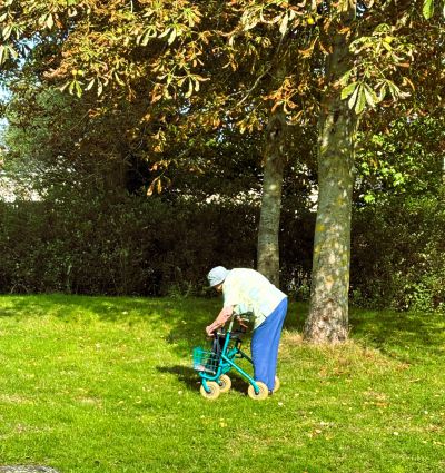 langsem búgt kastanjefrou foarover un blauwe hippe rollatòr is har tòt steun