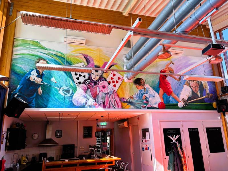 De foto hierboven, laat un prachtege wandskildering (‘dy’t met skroeven monteard is’) fan kunstskilder Jan Potma siën