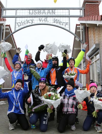 Ik stuur als bijlage mee de originele foto die ik daar maakte. Ik zou de namen van zowel de top-3 bij de jongens als bij de meisjes kunnen opsommen, maar volsta met twee nu nog bekende rijdsters. Op de voorste rij tweede van links – in de krans – de kampioene bij de meisjes Michelle de Jong (Rottum) – de jongere zus van Antoinette Rijpma-de Jong) – en rechts naast haar inderdaad Femke Kok (Nij Beets). De toen 12-jarige Femke werd derde in dat pupillenkampioenschap. Mvg,