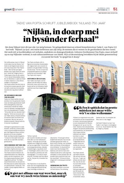 Fanmiddach foëlde ik in ut interview met Taeke van Popta ok. Taeke het un boek(ke) skreven over ‘Nijland 750 jaar’. Wêr’t ut met name over ging was ut mienskipsgefoël deur de eeuwen heen. Ok dit interview skriëf ik foar de GrootSneekkrant.